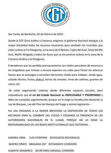 En un comunicado publicado el 2 de febrero, la CGT Zona Andina y Comarca exige al gobierno nacional que otorgue «a la mayor brevedad todos los recursos para necesarios para combatir los incendios que están activos en la Patagonia».