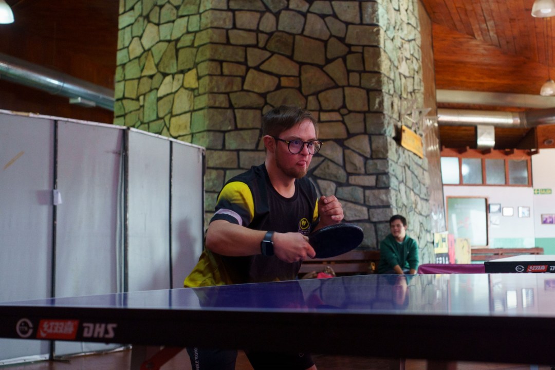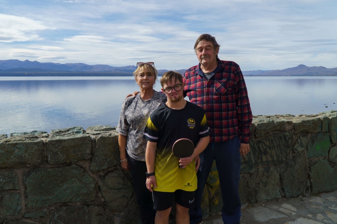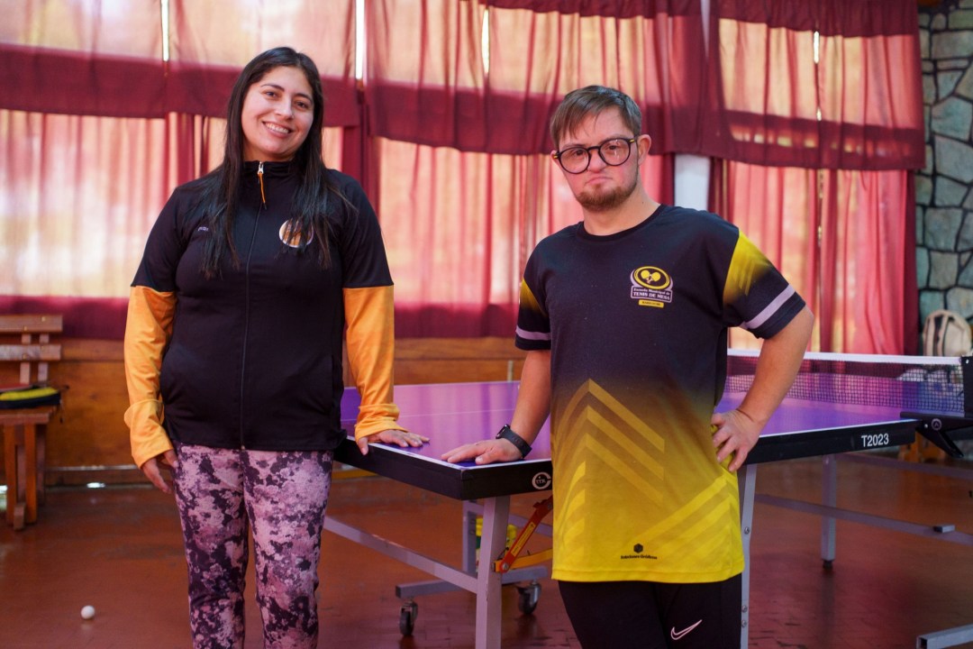 Paulina, la entrenadora, arma tres mesas de tenis mientras los alumnos van llegando a la Casa del Deporte de Bariloche, pegada al lago Nahuel Huapi. En un momento, se escucha: «¿Vamos, Mateo?» y, el peloteo comienza. El joven deportista se agacha concentrado y no saca sus ojos de la pelotita. «Bien cruzado», le indica Paulina y al rato, lo alienta: «Bien, ahí va». Cuando termina la entrada en calor, chocan sus manos y Mateo sonríe.