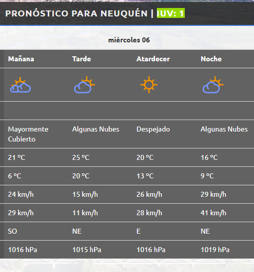 El miércoles la jornada en Neuquén comenzará con un cielo mayormente cubierto con una temperatura de 21°C que en el transcurso del día comenzará a elevarse hasta los 25°C. Hacia el atardecer se notará un descenso pudiendo llegar hasta los 16°C en la noche.