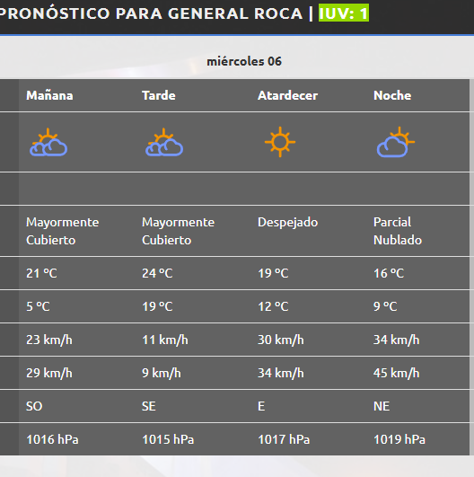 En Roca el panorama no será muy distinto. La mañana comenzará con un cielo cubierto y con temperaturas de 21°C, esta máxima se elevará hasta los 24 °C en la tarde y hacia el atardecer se espera que descienda hasta llegar a los 16°C en la noche.