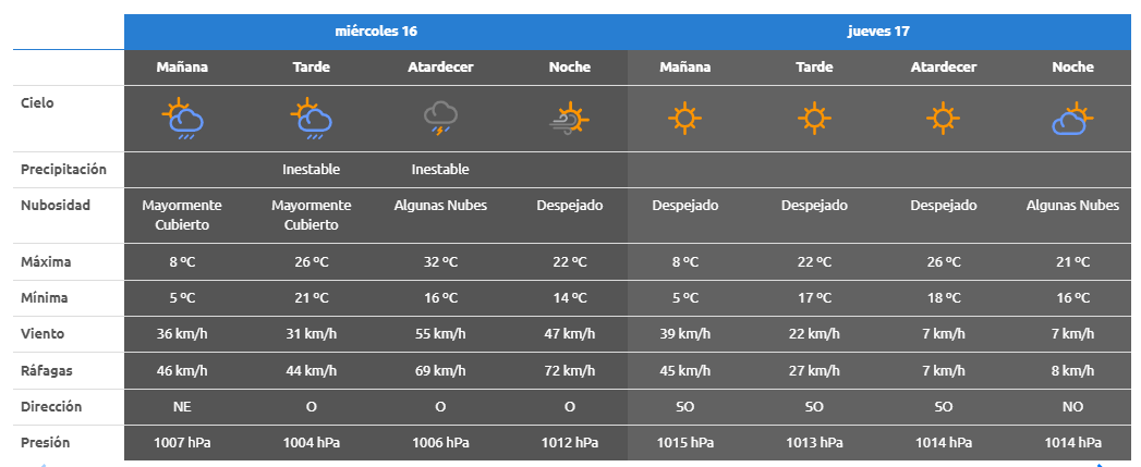 En Roca se espera que las temperaturas oscilen entre los 5°C y los 32°C este miércoles. Además, se esperan ráfagas que superarían los 70 km/h.