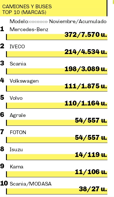 Mercedes-Benz colocó cinco modelos entre los diez más vendidos del mes en el sector de pesados.