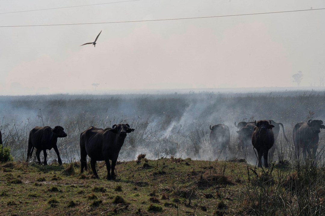 Sobre la Ruta Nacional 12 el humo se ve a la altura de la localidad de Ituzaingó, donde los troncos ennegrecidos de lo que fueron forestaciones que requirieron hasta 11 años de desarrollo para ser productivas comparten el paisaje con vacas y bueyes que huyendo de las llamas cruzan los alambrados quemados y vagan cerca de las banquinas en busca de agua.