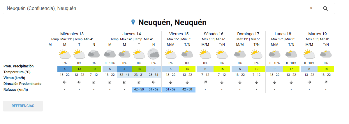 En la capital de Neuquén, según el pronóstico del Servicio Meteorológico Nacional se espera una jornada con temperaturas que van de los 4°C a los 13°C. Los cielos estarán parcialmente cubiertos y por la noche habrá más presencia de nubes. No habrá viento.