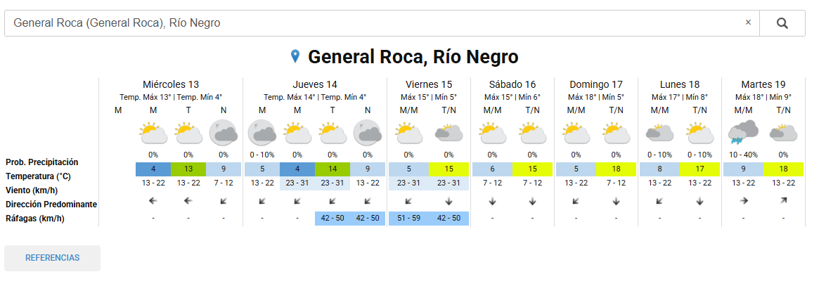 Para la ciudad de General Roca, se espera una jornada templada con temperaturas que irán desde los 4°C a los 13°C. Los cielos también se mantendrán cubiertos.