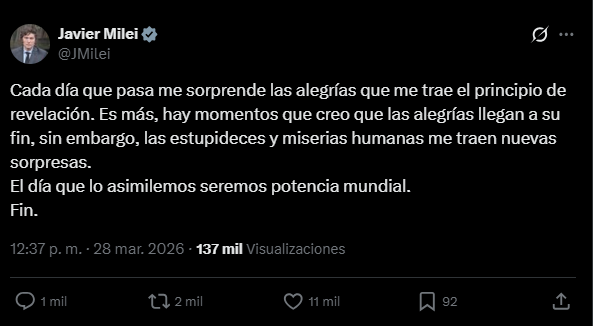 En su publicación, el mandatario volvió a referirse a su concepto del “principio de revelación” y aseguró que cada jornada le trae nuevas “alegrías”. “Cada día que pasa me sorprende las alegrías que me trae el principio de revelación. Es más, hay momentos que creo que las alegrías llegan a su fin, sin embargo, las estupideces y miserias humanas me traen nuevas sorpresas. El día que lo asimilemos seremos potencia mundial”, escribió.