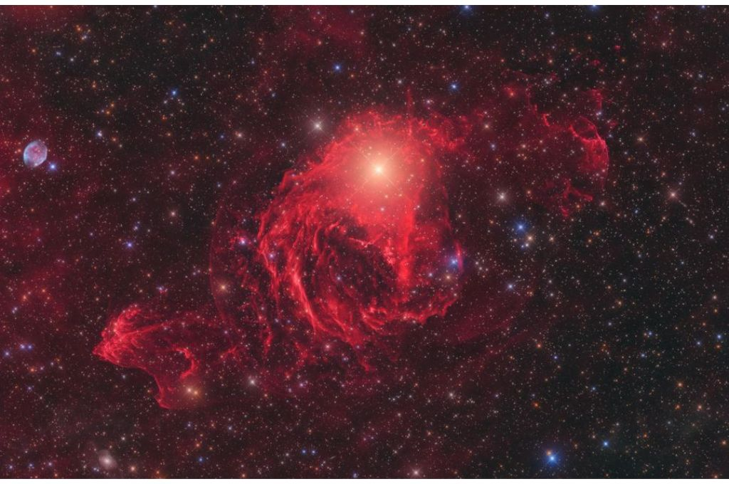 La luz del centro del gas es, en realidad, un par de estrellas binarias envueltas en la nebulosa que no había sido descubierta anteriormente. La autoría de la imagen corresponde a Marcel Drechsler y un equipo de astrónomos aficionados.