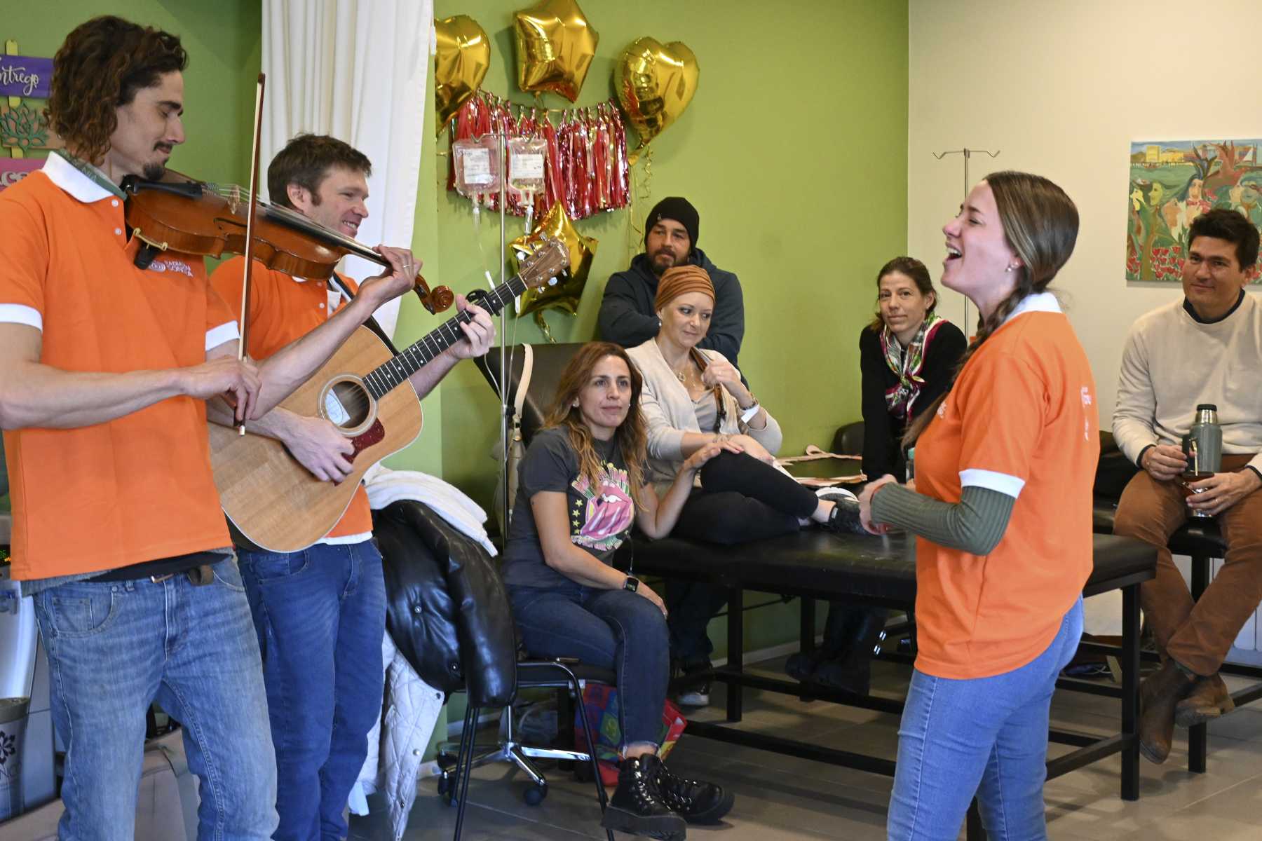 El ciclo «Radiación sonora» de la Fundación Intecnus convoca a músicos una vez al mes que se presentan en la sala de espera de la institución, donde los pacientes aguardan su turno. La semana pasada, Klempa mencionó que este miércoles tendría la última de las 16 sesiones de su tratamiento de quimioterapia. El trío musical no dudó en regresar para celebrar el cierre de la etapa.