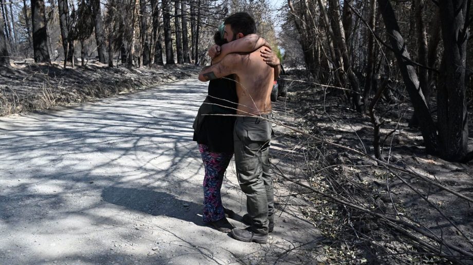 El abrazo apretado entre Natalia y Kevin estremeció la tarde en la zona del camino del río Azul, en Mallín Ahogado, mientras las columnas de humo en las montañas detrás, en el área natural protegida Río Azul- Lago Escondido (Anprale), crecían cada vez más y alrededor la postal era desoladora: esqueletos de árboles calcinados, estructuras de viviendas destruidas y el suelo aún caliente.