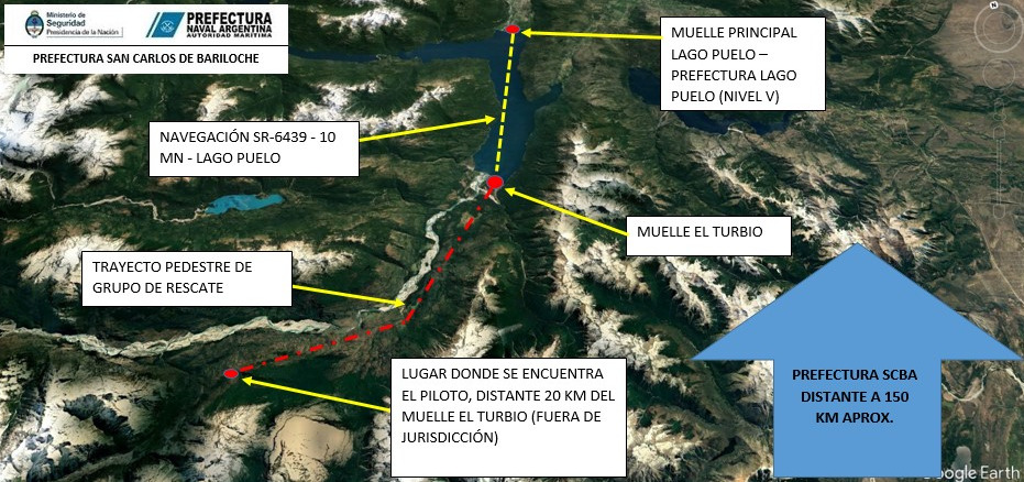 Prefectura Naval Argentina llevó a los cuatro gendarmes desde el Lago Puelo hasta el paraje Río Turbio. Los cruzó de punta a punta en una lancha. Ahí se juntaron con un baqueano que también participó del rescate. El plan de los gendarmes era rescatar a “Queque” Parodi, guarecerse, pasar la noche en la montaña si era necesario y emprender el camino de regreso al otro día. Pero los planes cambiaron. Cerca de las 14 el equipo de rescate empezó a escuchar a un helicóptero que sobrevolaba la zona. Con un teléfono satelital se comunican con la base de Defensa civil de Golondrinas. Del otro lado les dijeron: “Muchachos, vuélvanse, retírense porque ya fue rescatado el piloto”.