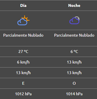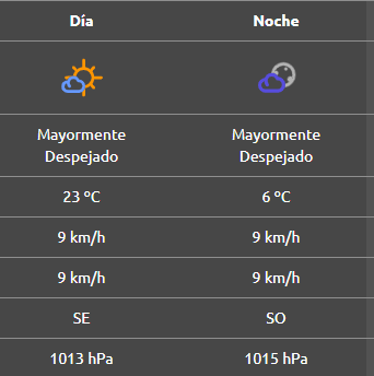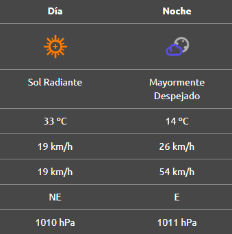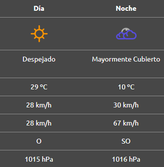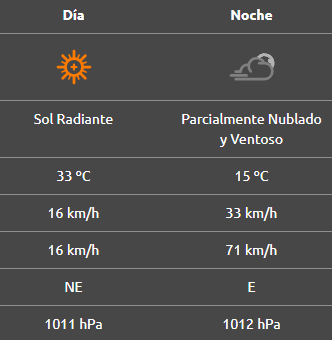 Por la noche se espera que esté parcialmente nublado y ventoso, con una mínima de 15°C y ráfagas provenientes del este a más de 70 km/h.