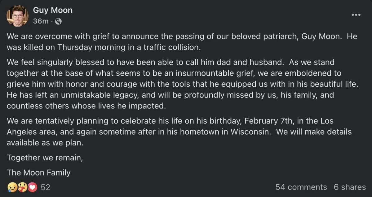 “Nos embarga el dolor al anunciar el fallecimiento de nuestro amado patriarca, Guy Moon. Murió el jueves por la mañana en un accidente de tráfico. Nos sentimos singularmente bendecidos de haber podido llamarlo padre y esposo”, comunicaron sus allegados.