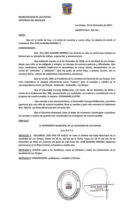 Dolor en el norte neuquino por la muerte de un reconocido vecino. Murió a las 94 años, José Aladino Merino, que en 2018 fue declarado ciudadano ilustre en Las Ovejas.