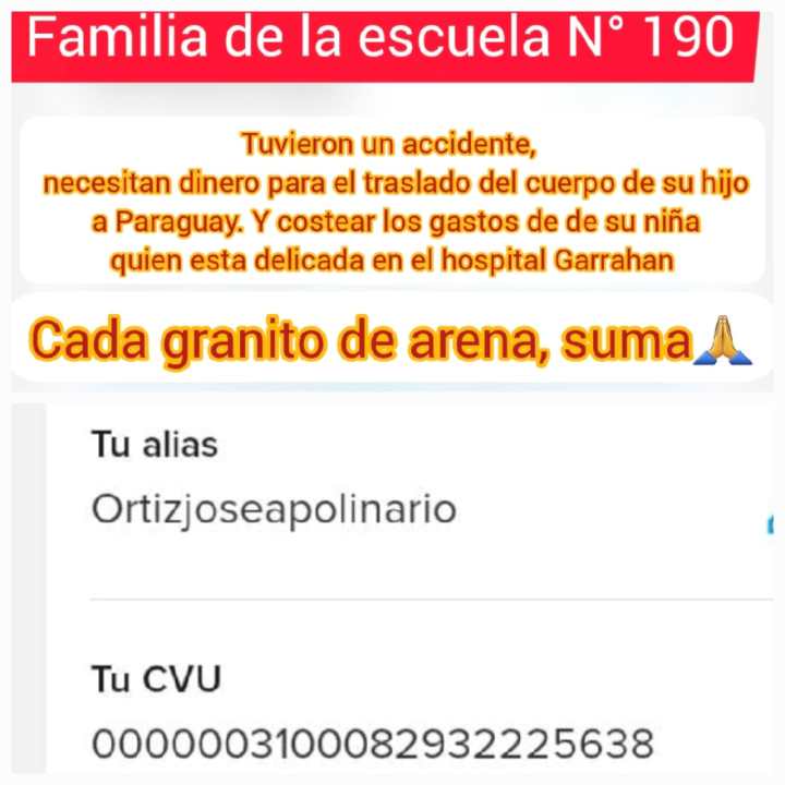 La docente aclaró que la colecta se inició para poder trasladar el cuerpo de Oscar a Paraguay, para lo que la familia necesita 700 mil pesos. Desde ATEN difundieron la colecta y los datos, para quienes quieran colaborar: