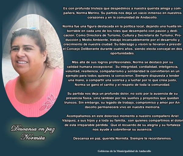 Con una placa acompañada de la foto de Norma Merino, el Ejecutivo expresó: «Es con profunda tristeza que despedimos a nuestra querida amiga y compañera, Norma Merino. Su partida nos dejó un vacío inmenso en nuestros corazones y en la comunidad de Andacollo».