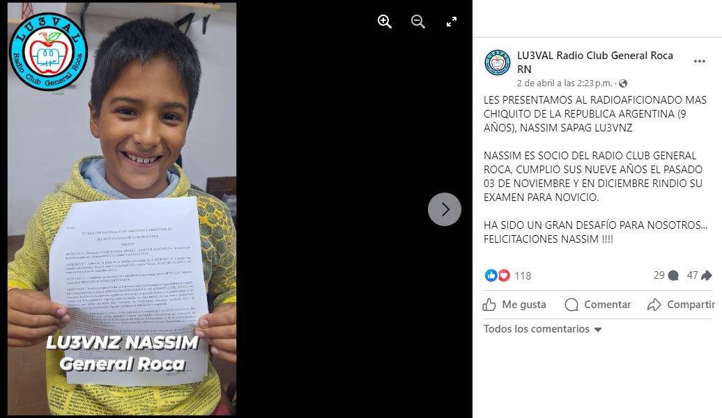 Muchos fueron los mensajes de felicitación que recibió Nassim Sapag, este niño de nueve años de Roca, después de que el RadioClub local anunciara que se había convertido en el radioaficionado más joven de Argentina. Nada más y nada menos, en un ambiente que quizás parece alejado de los más chicos, pero que con esta experiencia demuestra no sólo su vigencia, sino también la capacidad de adaptarse para incorporar nuevos adeptos.