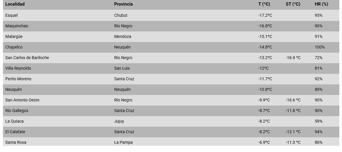 El SMN compartió el ranking de las ciudades más frías, en medio de una ola polar con temperaturas extremas que afecta a todo el país. En el puesto número 1° se encuentra Esquel, en Chubut, con -17,2°C. Algunos puestos más abajo están Maquinchao, con -14,8°C y Neuquén capital con -10,8°C.