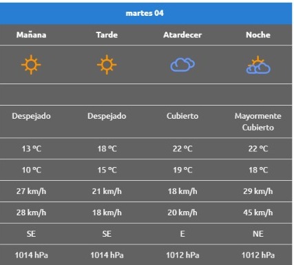 Por otra parte, el cielo pasará de parcialmente nublado a despejado y el viento, como en Neuquén, también dirá presenta a la noche: podría anotar velocidades superiores a los 42 km/h.