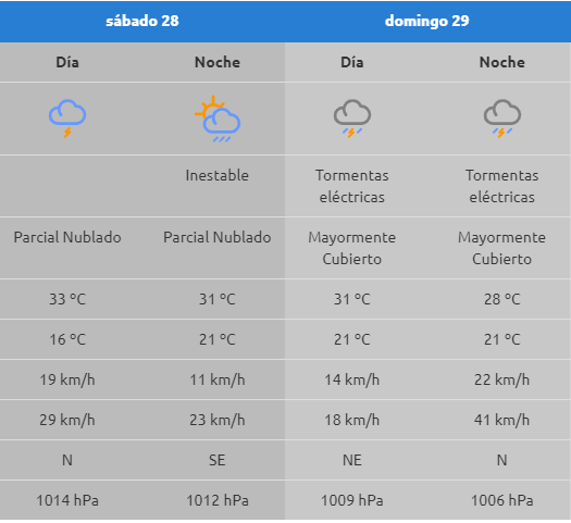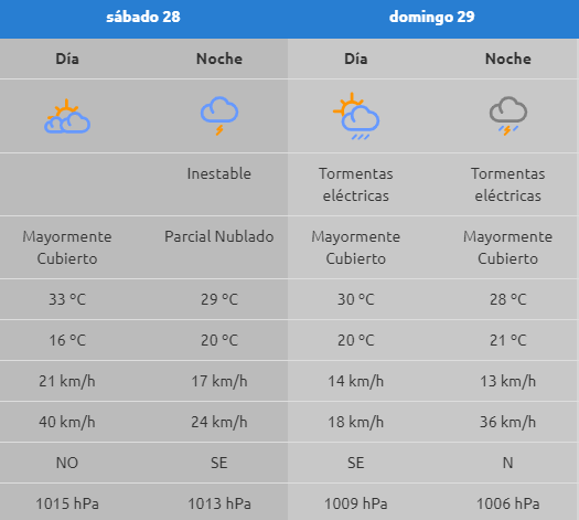 En Neuquén capital, para el día sábado, se espera una máxima de 33°, con cielo nublado durante el día e inestabilidad hacia la noche, con posible actividad eléctricas. Para el domingo, la máximas será de 30, y se espera tormenta eléctrica durante toda la jornada.