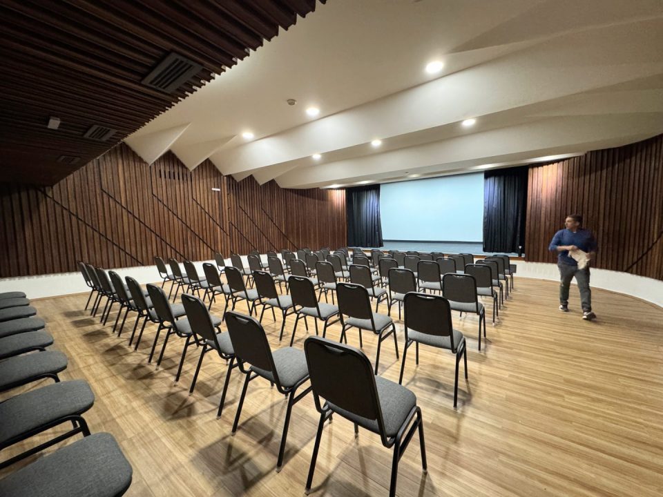 Se retiraron las butacas tipo cine, que estaban destartaladas y se usarán sillas en un espacio, que según se indicó, alcanza para 80 personas, pero se priorizará un espacio más saludable con 70 sillas destinadas al lugar. También hubo mejoras en la infraestructura del techo y según se indicó, hubo mejoras en la acústica.