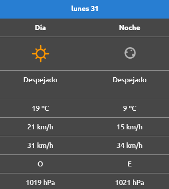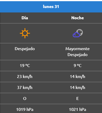 El pronóstico indica que durante el día el cielo estará despejado y la temperatura alcanzará los 19 °C, mientras que por la noche descenderá hasta los 9 °C. A diferencia del domingo, cuando las ráfagas de viento llegaron hasta los 68 km/h, este lunes se esperan vientos de 23 km/h con ráfagas de hasta 37 km/h, provenientes del oeste. En la noche el viento descenderá aún más, llegando a 14 km/h.