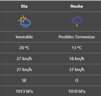 Para la noche se esperan posibles tormentas, la temperatura descenderá a 13°C con ráfagas de viento que alcanzaran los 37 km/h. El fenómeno climático podría traer aparejadas tormentas eléctricas y chaparrones durante la tarde-noche.