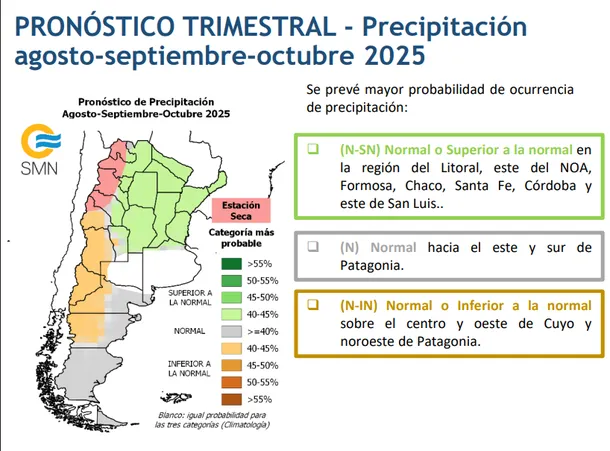 Hacia el este y sur de la región, en cambio, las lluvias se mantendrían dentro de los niveles habituales para agosto, septiembre y octubre.