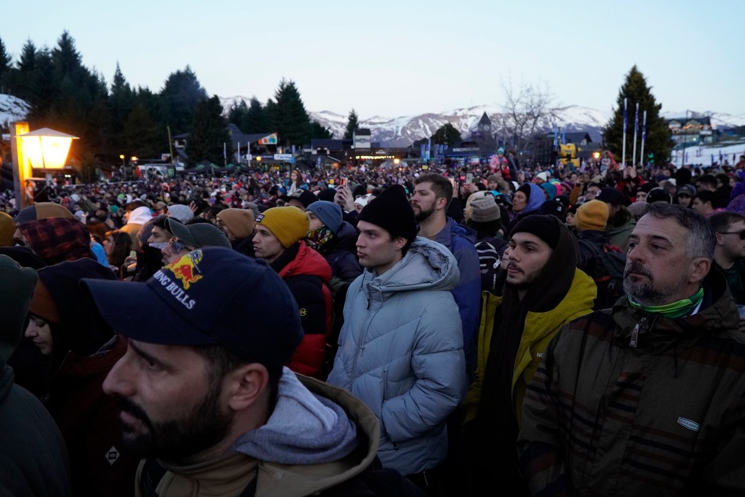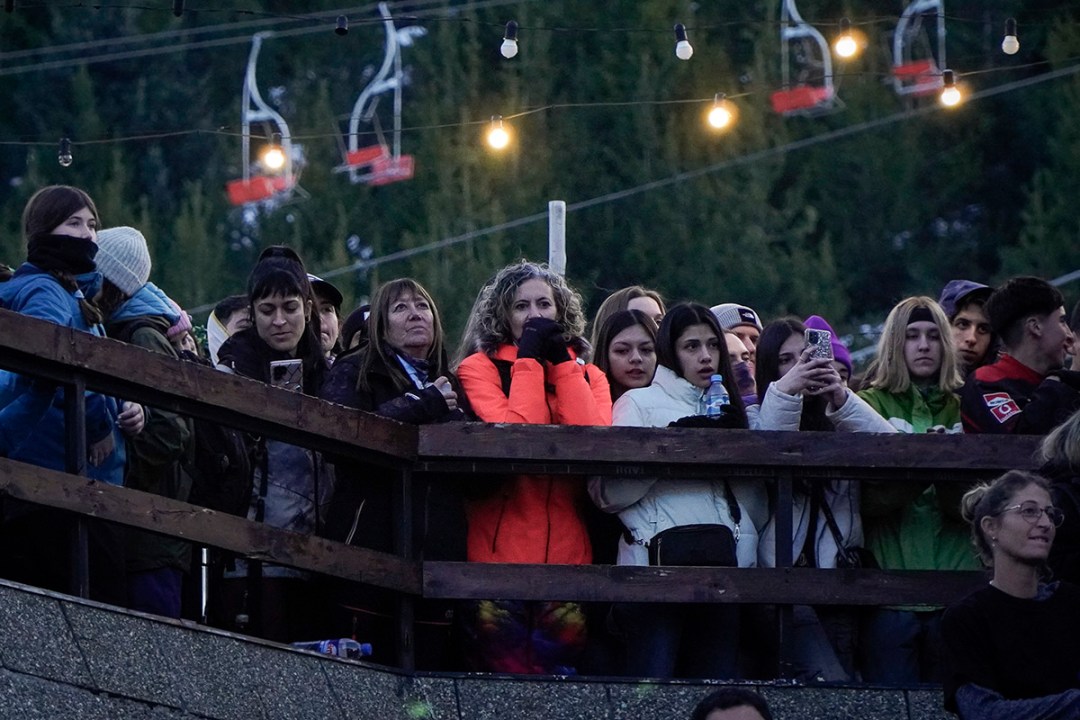 Mientras tanto, por la montaña bajaban los últimos esquiadores y snowboardistas, y cientos de personas que habían disfrutado del cerro este sábado circulaban por las calles internas de Villa Catedral y observaban el recital desde terrazas y locales gastronómicos.