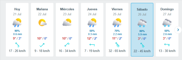 Los días más fríos serán el sábado y el domingo, momento en que las temperaturas alcanzarán máximas de tan solo 3°C y mínimas de 0°C. Ese fin de semana esta pronosticada la llegada de la nieve, durante la madrugada del sábado y que se extenderá hasta la madrugada del domingo.