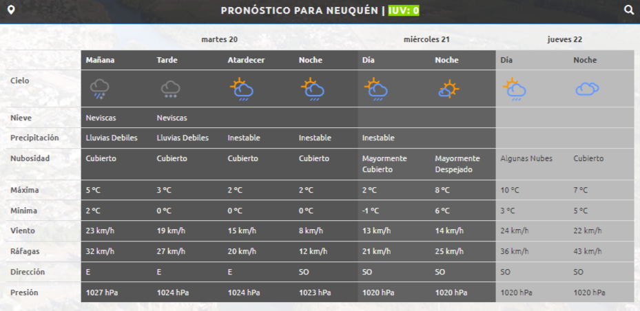 Según informó el SMN, en el Alto Valle y Neuquén capital se esperan lluvias persistentes con intensidad variada y con valores de precipitación acumulada entre 10 y 20 mm. No se descarta la presencia de lluvia y nieve mezclada.