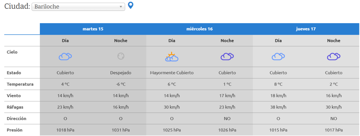 El martes 15 de julio se esperan vientos que alcancen los 45km/h. La máxima será de 15°C y la mínima de -4°C, con un cielo parcialmente nublado.