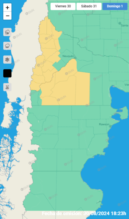 En cuanto a la nieve, se espera con intensidad en la Cordillera de Huiliches, Cordillera de Lácar, Sur de Aluminé y en Los Lagos.