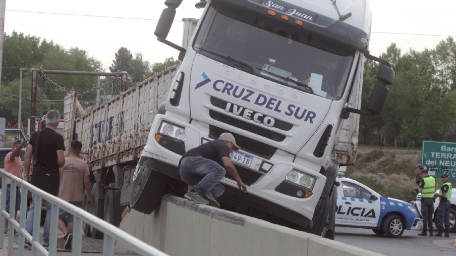 Este viernes por la tarde un nuevo incidente sorprendió a los vecinos del barrio Alta Barda y Mercantiles en Neuquén. Un camión circulaba por la zona y cuando quiso doblar, no alcanzó y quedó arriba de un puente peatonal que conecta la ciudad sobre Ruta 7. El tránsito en el lugar está con demoras.