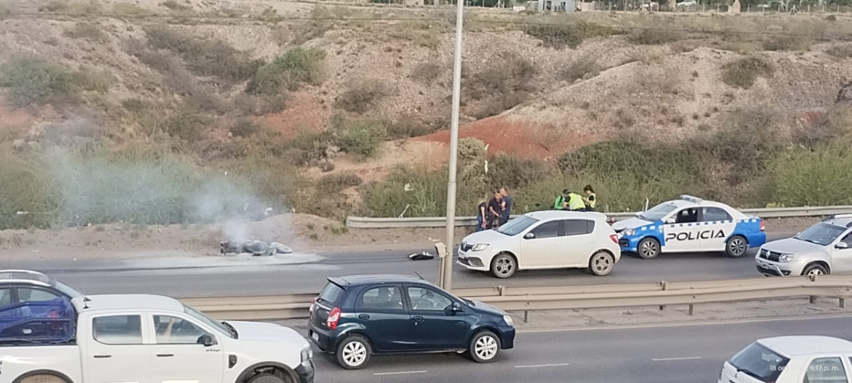 Por el incidente, el tanque de combustible del camión se rompió y quedó desparramado sobre el puente de Ruta 7. Personal policial y bomberos, no alertaron la situación y mientras una moto circulaba por el lugar, resbaló con el combustible y produjo el incendio de la misma.
