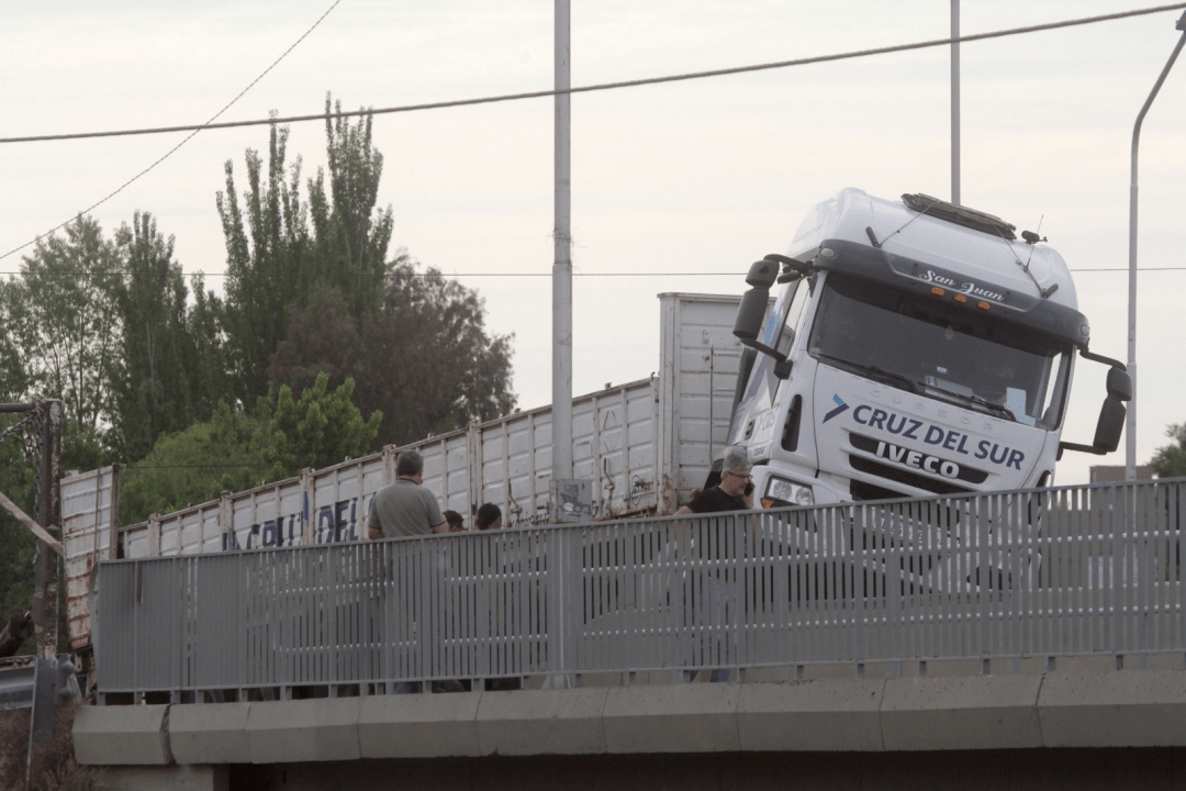 Según las primeras informaciones, un camión marca Iveco cursor 360 quedó colgado sobre el sector peatonal del puente de Cabellera del Frío sobre la avenida Raúl Alfonsín.