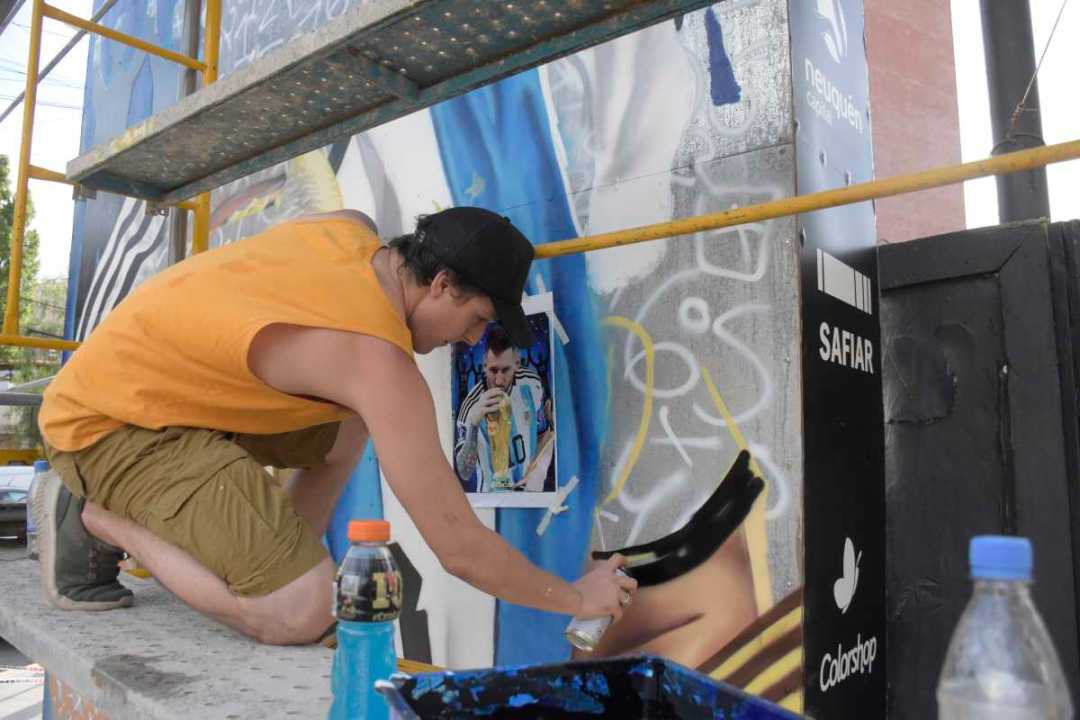 Se llama Rodrigo, tiene 30 años y está en plena realización de su tercer mural relacionado a la selección argentina y a Lionel Messi en Neuquén capital.