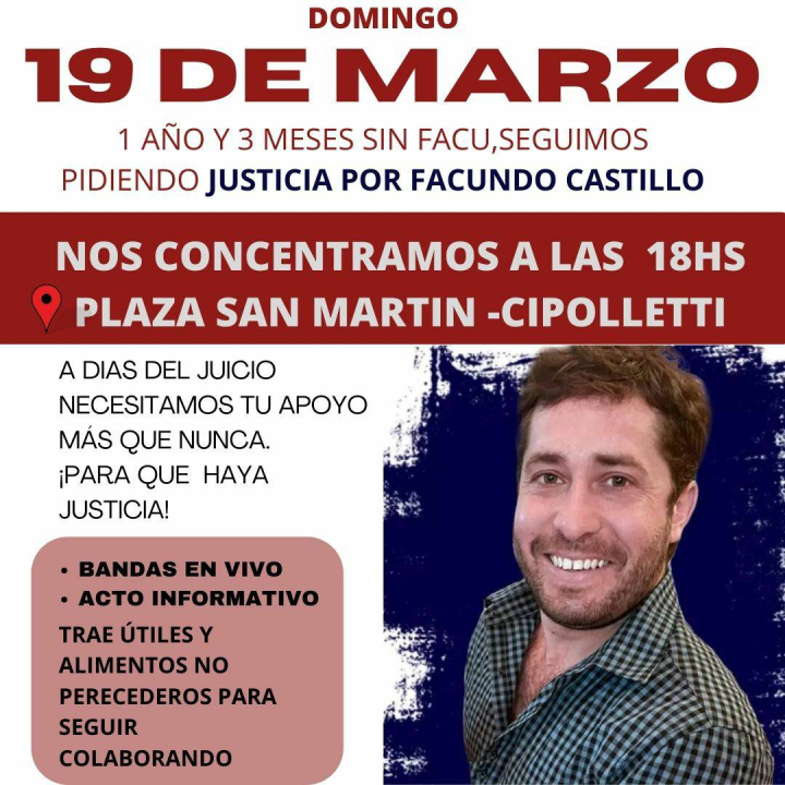 Este domingo se llevó a cabo una nueva marcha en la Plaza San Martín de Cipolletti pidiendo de justicia por el crimen de Facundo Castillo. Además de la concentración de personas, se desarrollaron shows musicales en vivo y una colecta de alimentos y útiles para "seguir colaborando", fue el pedido en redes sociales.