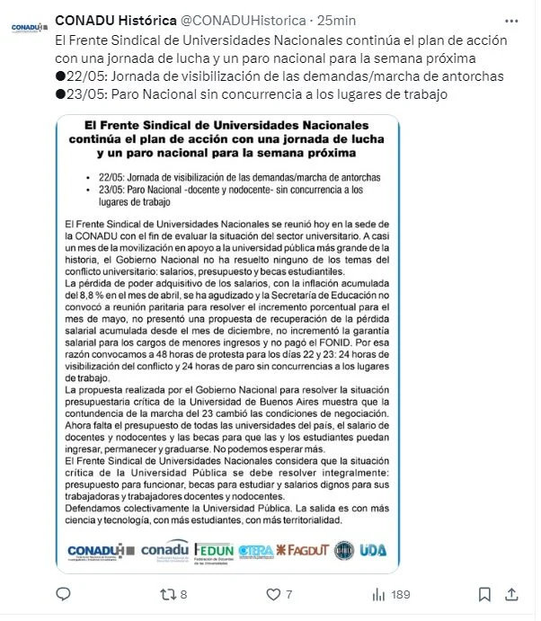 «La propuesta realizada por el Gobierno Nacional para resolver la situación presupuestaria crítica de la Universidad de Buenos Aires muestra que la contundencia de la marcha del 23 cambió las condiciones de negociación. Ahora falta el presupuesto de todas las universidades del país, el salario de docentes y nodocentes y las becas para que las y los estudiantes puedan ingresar, permanecer y graduarse. No podemos esperar más», expresaron en el comunicado.