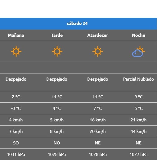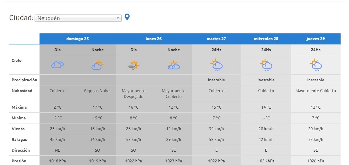 El domingo, en la capital neuquina el termómetro iniciará la jornada desde las -2°C mientras que, luego del mediodía, llegaría hasta unos para nada despreciables 17°C, con algunas nubes.