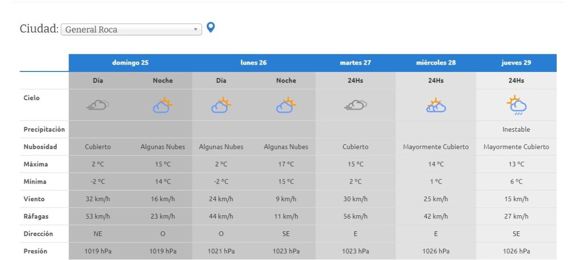 Si se recorren unos 40 kilómetros hacia el este, en Genera Roca, el panorama es similar, con iguales registros que Neuquén para el día sábado: -3°C de mínima y 11°C de máxima.