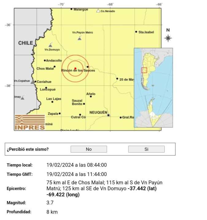 Según informó el Instituto Nacional de Prevención Sísmica (Inpres) fue de magnitud 3,7 y fue a 75 kilómetros al este de Chos Malal. Ocurrió a una profundidad de 8 kilómetros.