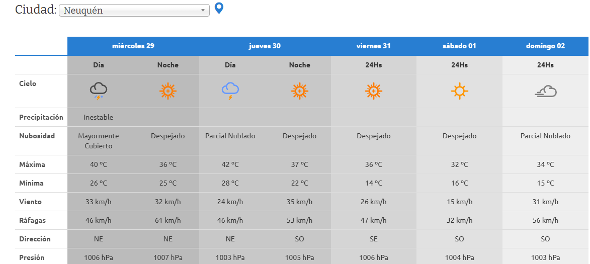 En Neuquén, el jueves la máxima alcanzará los 42°C y en Roca, los 41°C. Hay probabilidades de tormentas. El día anterior, la temperatura llegará hasta los 40°C y las ráfagas hacia la noche superarán los 60 km/h.