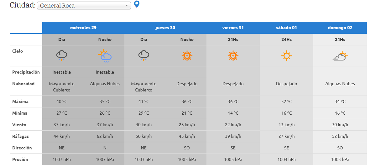 Este martes, se esperan en el Alto Valle máximas de 36° C, con posibles tormentas sobre la noche. Sobre el final del día las ráfagas superarían 40 km/h.