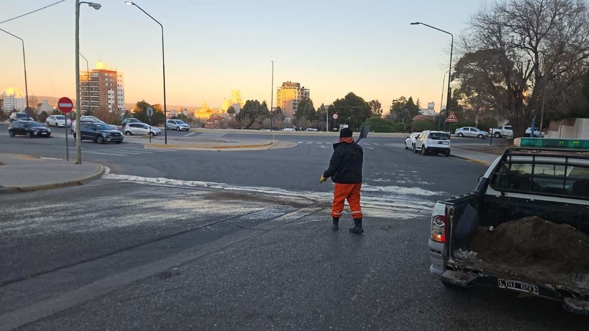 Este lunes, se desplegó un operativo en la intersección de Gelonch y Avenida Roca, donde se detectó escarcha provocada por una pérdida de agua. Se colocó arena para mejorar la adherencia en el pavimento, y se notificó a ARSA sobre la situación. Si bien desde la firma indicaron que la pérdida fue reparada, el agua persiste en el lugar, lo que obliga a mantener la precaución.