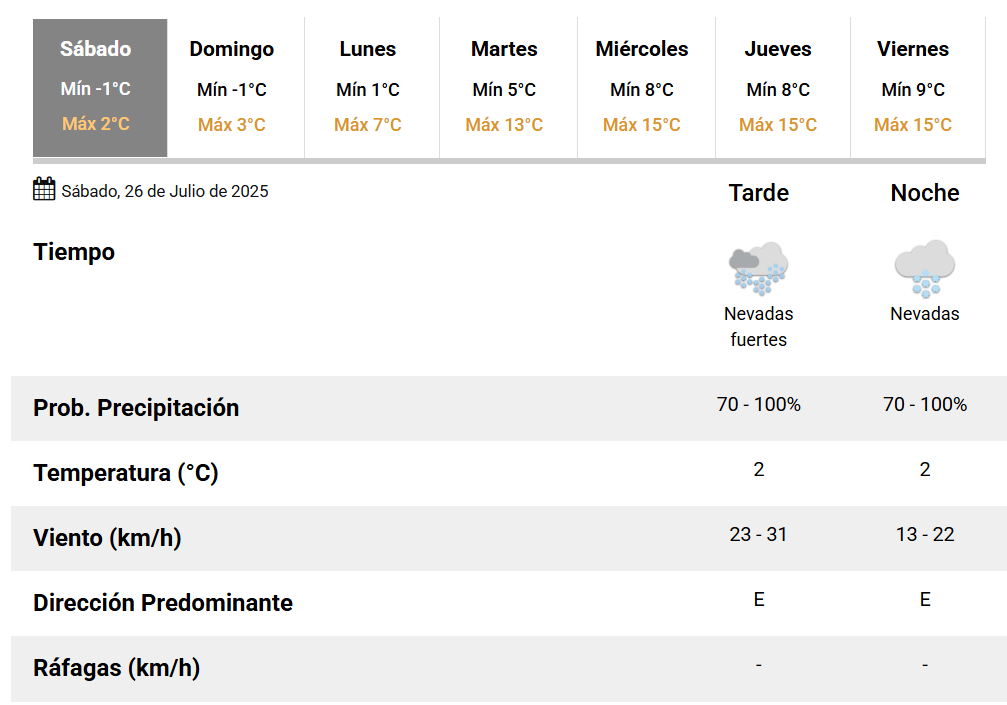 The Weather Channel, presente en casi todos los celulares, pronostica nevadas constantes durante todo el sábado 26 de julio, hasta las 13 del domingo 26.