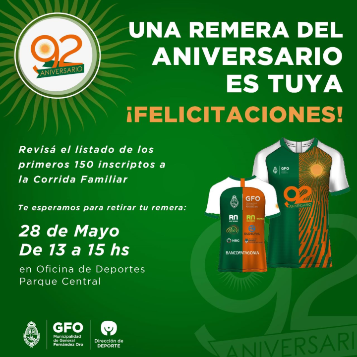 Para retirar sus remeras deberán presentarse personalmente el domingo 28 de mayo entre las 13 y 15 en la oficina de Deportes ubicada en 9 de Julio y Avenida Cipolletti.