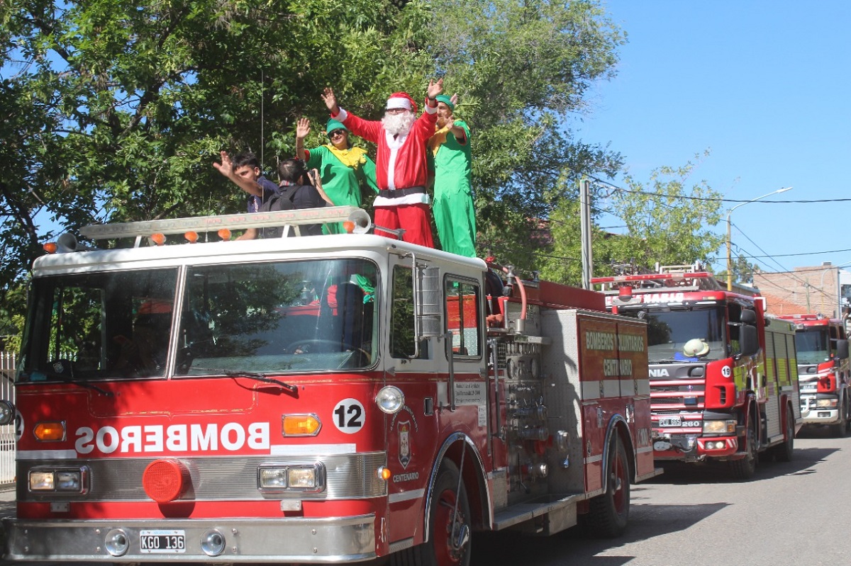Papá Noel y sus duendes recorrieron Centenario con los bomberos voluntarios