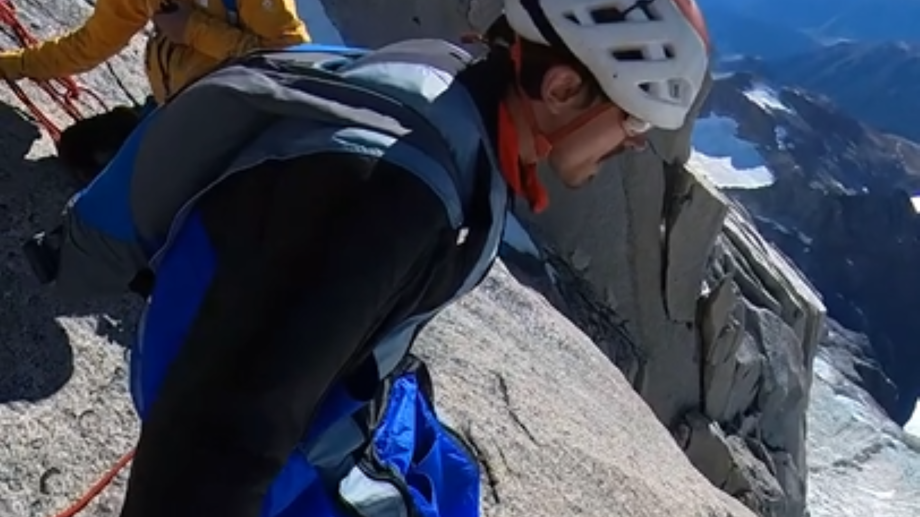 Respiración constante y audible, un salto, la velocidad con la que el traje choca con el aire. Todo está resumido en un solo video. El paisaje que rodea, la montaña de fondo y el lago de frente. Ese hombre, que salta, desde la punta del Aguja Saint Exupery, parece convertirse en pájaro.