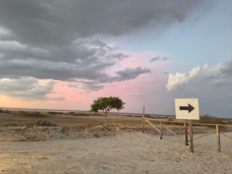 El cielo se tiñe de rosa y el contraste es casi onírico. Cuando las primeras gotas anuncian una tormenta de verano y la luz comienza a apagarse, llega el momento de irse. El camino de regreso es distinto, bajo ese cielo. Al pasar el cartel de Puerto del Este, mesas y focos le dan al lugar un aire de feria improvisada. En la orilla, letras corpóreas talladas en madera lo dicen sin vueltas: Caribe de la Patagonia.