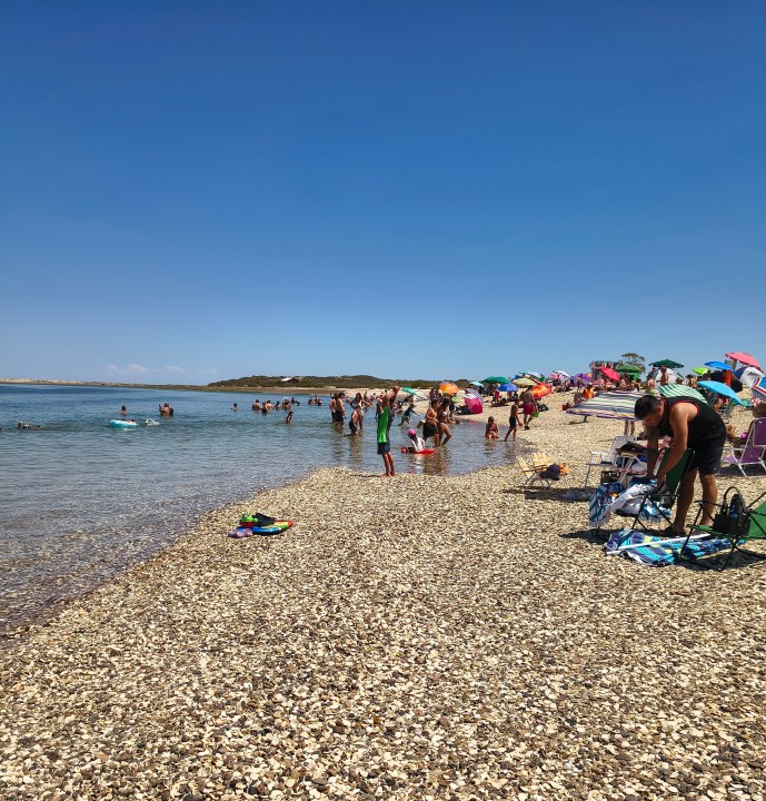 El camino hacia la playa avanza entre crujidos. El azul del mar planchado y el blanco infinito de los bivalvos, de fondo, se corta con lunares de colores: carpas y sombrillas que coparon la costa. Todo encandila.